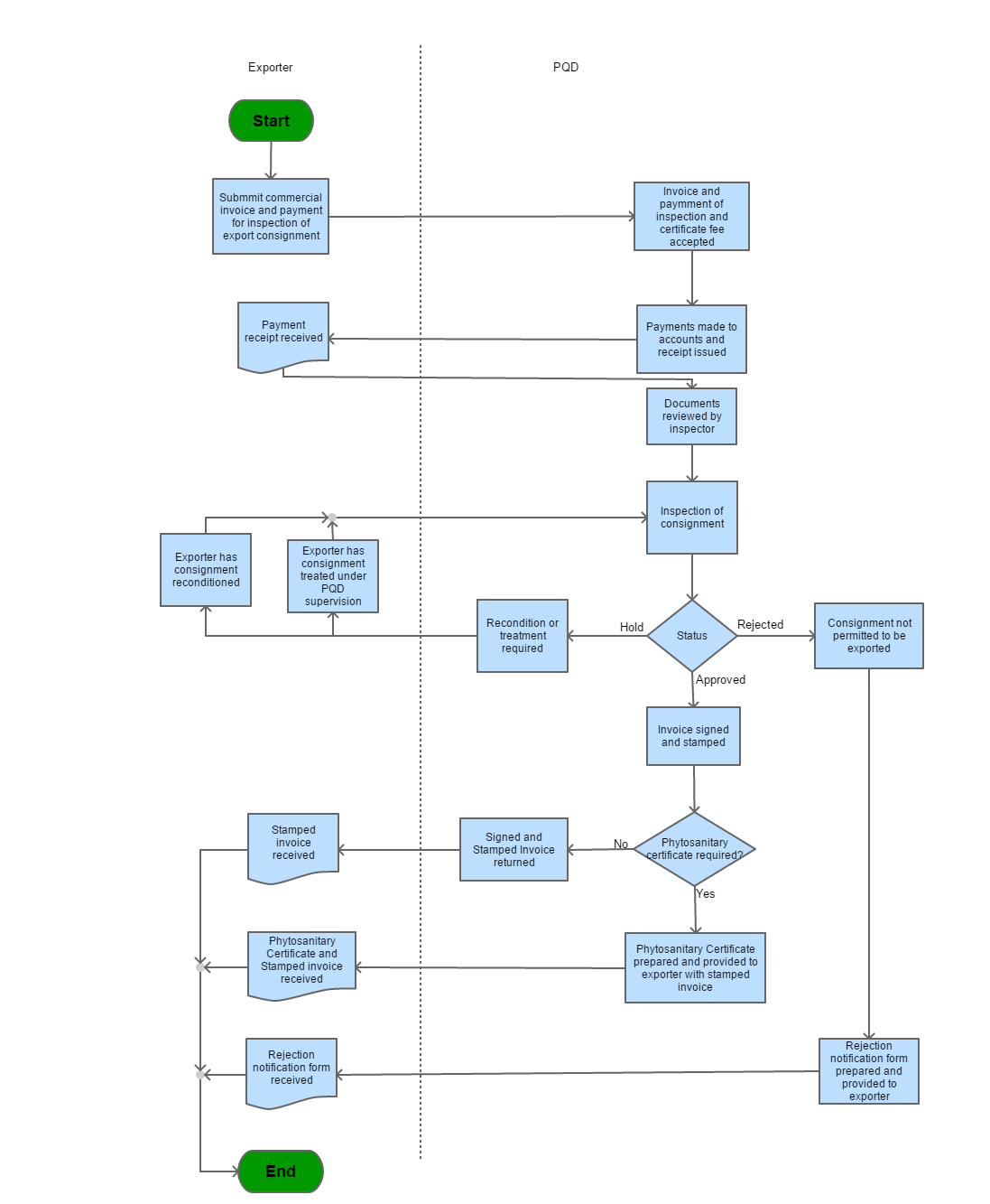 If the status of the consignment is approved then: i) Invoice signed and stamped ii) A phytosanitary certificate may be required If the status of the consignment is on hold then: i) Recondition or treatment required ii) The exporter has consignment treated under PQD supervision iii) The exporter has consignment reconditioned iv ) Inspection of consignment If the status of the consignment is rejected then: i) Cosignment not permitted to be exported ii) Rejection notification form prepared and provided to the exporter iii) Rejection notification form received